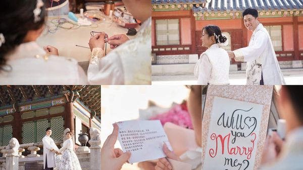Surprise your partner with a romantic proposal during a K-Historical Enchantment tour in Korea, where you'll don traditional Hanbok costumes, participate in a K-Traditional class, and reveal a hidden "Will you marry me?" message in a certificate before celebrating your engagement with a bouquet and an enchanting photo session.