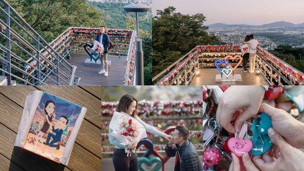 Experience a stunning proposal at Namsan Tower: purchase matching padlocks, write messages in a cozy café, surprise her with a love letter and a personalized video, guide her to the padlock wall for a proposal featuring a framed caricature, and celebrate your engagement with a romantic dinner in the tower's enchanting atmosphere.